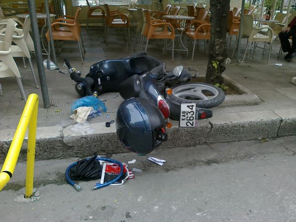 Νεαρός αλλοδαπός που οδηγούσε μαύρο διθέσιο cabrio αυτοκίνητο, λίγο μετά τις 4 το απόγευμα, κάνοντας "επίδειξη οδήγησης" στην πλατεία Πάρκου στο κέντρο της Λαμίας,μπήκε στη στροφή τραβώντας χειρόφρενο και έπεσε πάνω στη μπάρα του parking για μηχανάκια, ενώ στη συνέχεια χτύπησε και το μηχανάκι που βλέπετε και έφυγε σπινιάροντας, αδιαφορώντας για τις ζημιές που προκάλεσε.