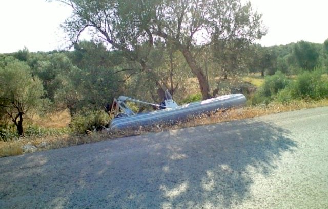 Άγιο στο δρόμο του ...Αγίου είχε ο ιδιοκτήτης του φουσκωτού σκάφους της φωτογραφίας, αφού δεν προκάλεσε ατύχημα με οδυνηρές συνέπειες. Το τρέηλερ με το σκάφος έφυγε από τον κοτσαδόρο του οχήματος και κατέληξε στο χωράφι!